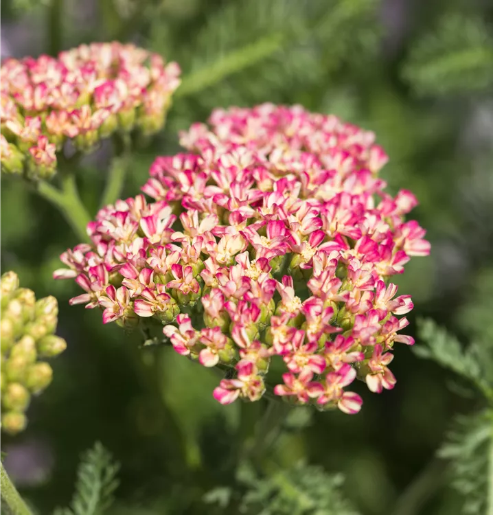Achillea millefolium 'Milly Rock Rose' bildet in Dolden angeordnete, dunkelrosafarbene Blüten ab Juni. Diese verströmen einen angenehmen Duft. Bei richtiger Pflege Nachblüte im September.