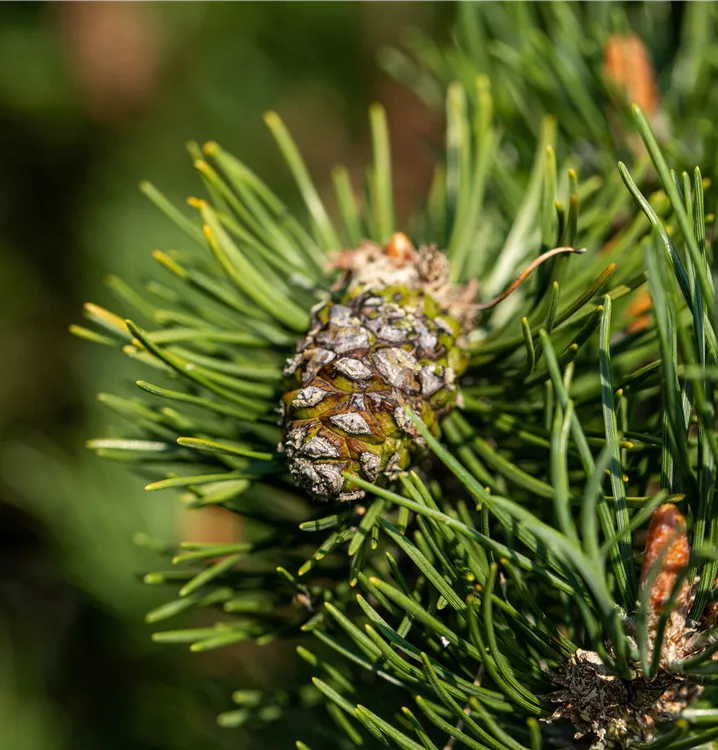 Die Zapfen von Pinus mugo 'Laurin' erscheinen ab Oktober. Die jungen Zapfen haben eine rosarote Färbung.
