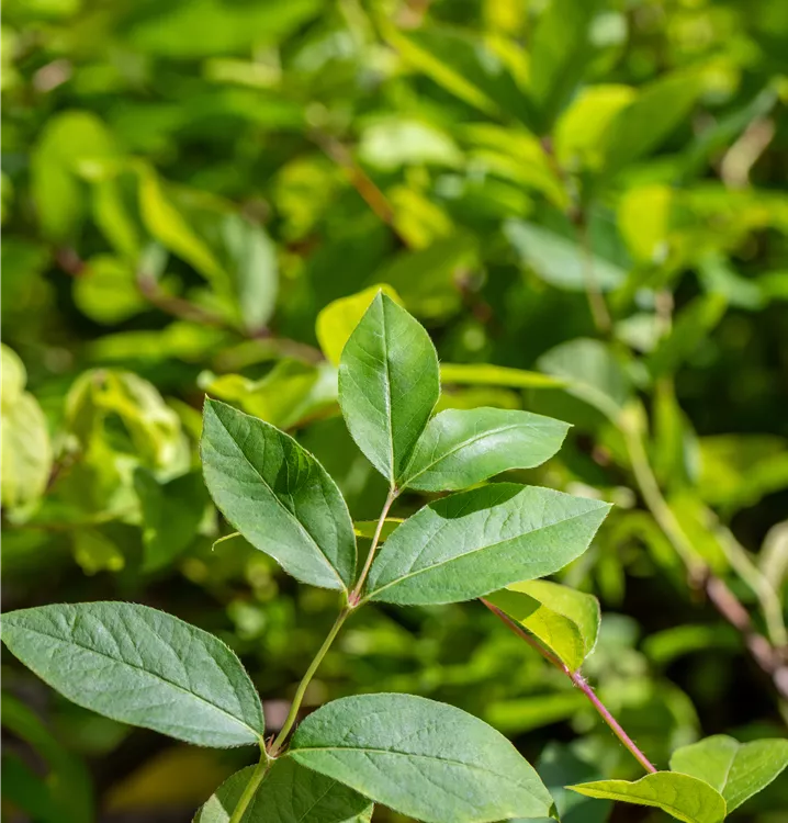 Die wintergrünen Blätter der Winter-Heckenkirsche sind dunkelgrün, lanzettlich, gegenständig. Diese sind etwa 5 - 8 cm groß.