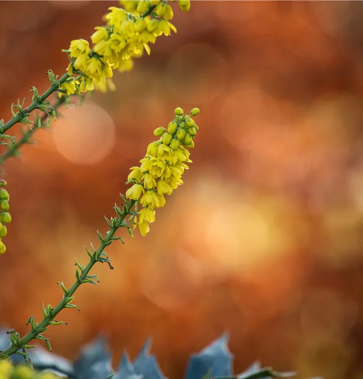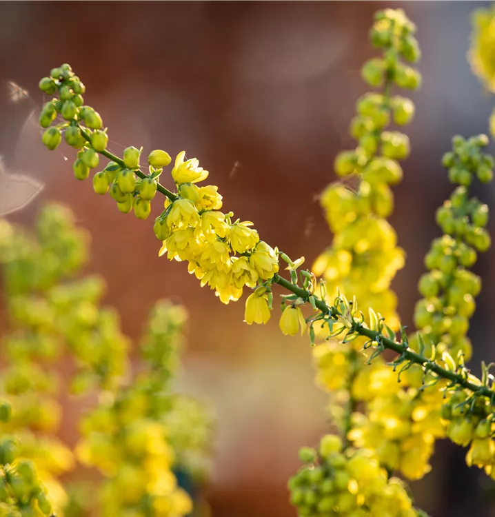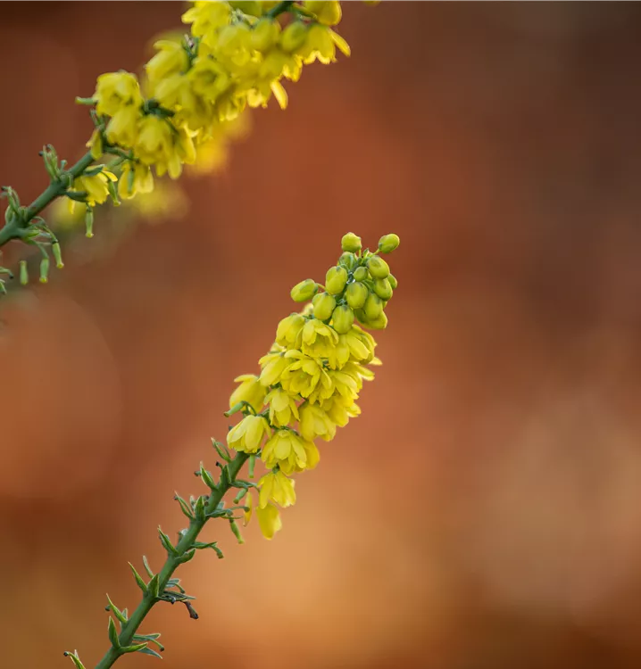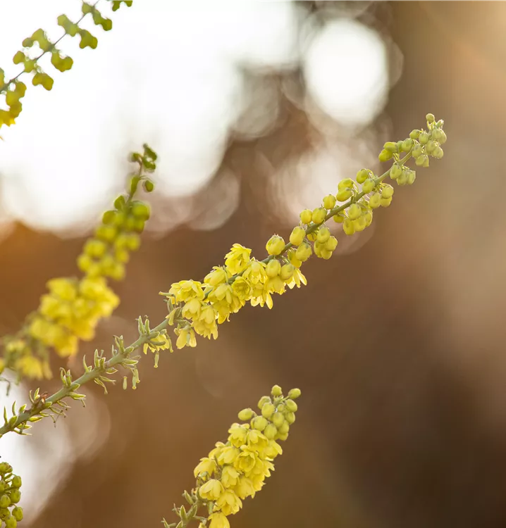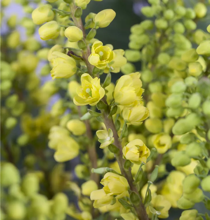 Die gelben Blüten der Mahonie 'Winter Sun' erscheinen in Trauben von Januar bis April. Diese werden etwa 20 - 30 cm groß und sind angenehm duftend.