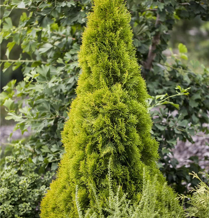 Der Lebensbaum 'Golden Smaragd'® (Thuja occidentalis) ist ein Großstrauch, welcher kegelförmig, aufrecht wächst und gewöhnlich eine Höhe von ca. 5 m und eine Breite von ca. 1,5 m erreicht. Seine schuppenförmigen Blätter haben eine gelb-grüne Färbung. Dekorative Zapfen zieren Thuja occidentalis 'Golden Smaragd'® ab Oktober. Dieses Gehölz ist gut frostverträglich.Er bevorzugt kalkhaltigen, nährstoffreichen, sandigen, lehmigen Boden in sonniger bis halbschattiger Lage.