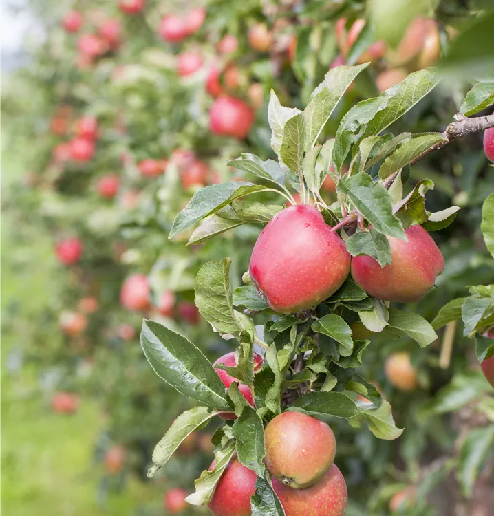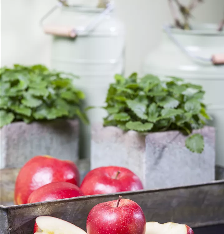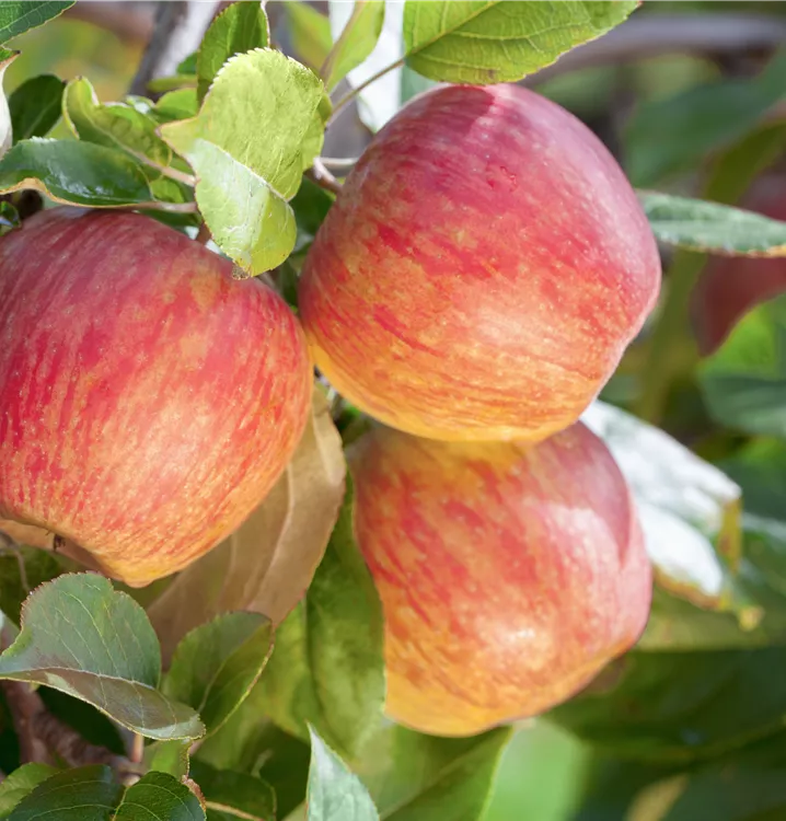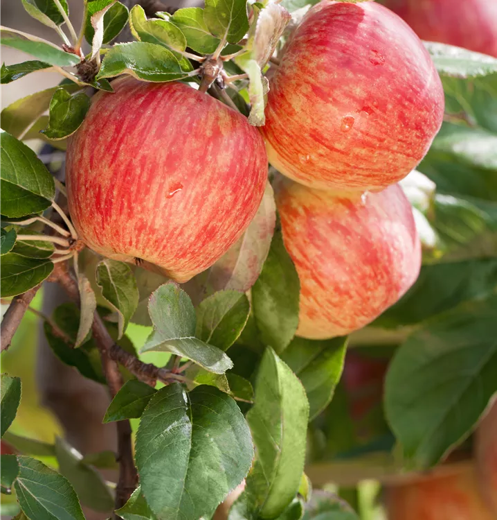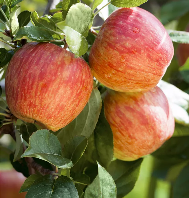 Der Apfel 'Gala' (Malus domestica) bildet hellrote, kleine, feste Früchte. Sie haben einen süßen, saftigen Geschmack. Für eine ertragreiche Ernte ab Mitte September schaffen durchlässiger, nährstoffreicher Boden und ein sonniger bis halbschattiger Standort optimale Bedingungen. Seine hellrosafarbenen Blüten sind eine schöne Erscheinung. Der Apfel 'Gala' wird mit seinem aufrechten und breiten Wuchs etwa 4 m hoch und 3 m breit.