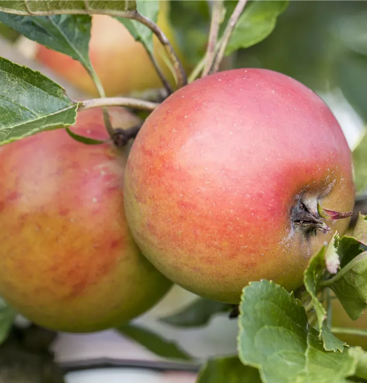 Der Apfel 'Carola' (Malus domestica) bildet gelb-rote, mittelgroße, mittelfeste Früchte. Sie sind rund und haben einen süß-säuerlichen Geschmack. Für eine ertragreiche Ernte ab September schaffen durchlässiger, nährstoffreicher Boden und ein sonniger bis halbschattiger Standort optimale Bedingungen. Seine hellrosafarbenen Blüten sind eine schöne Erscheinung. Der Apfel 'Carola' wird mit seinem aufrechten und breiten Wuchs etwa 4 m hoch und 3,5 m breit.