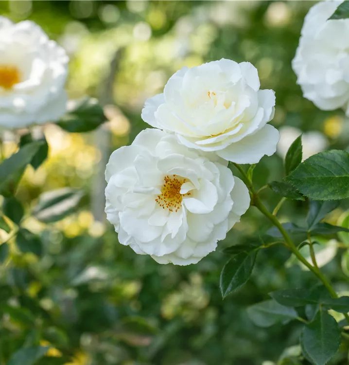 Die Beetrose 'Kristall' (Rosa) ist eine reichblühende Rose, die im Garten eine besondere Rolle spielt. Die zahlreichen gefüllten Blüten sind weiß und erscheinen von Juni bis September. Ihr wunderbarer Duft entfaltet sich besonders an sonnigen, warmen Tagen.