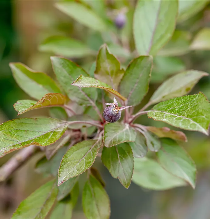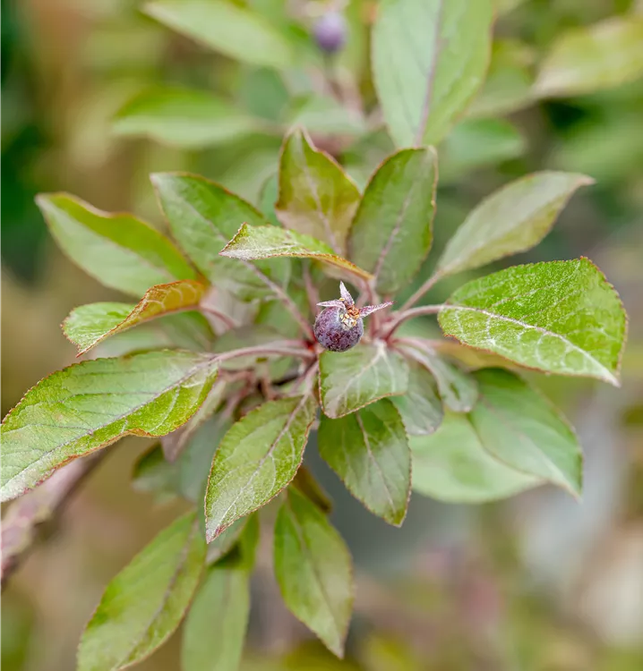 Besonders dekorativ sind die dunkelroten, ovalen Früchte von Malus 'Royalty'. Diese erscheinen ab Oktober und sind klein.