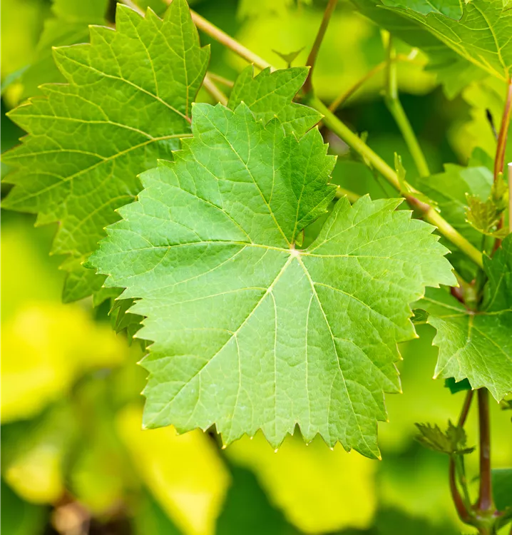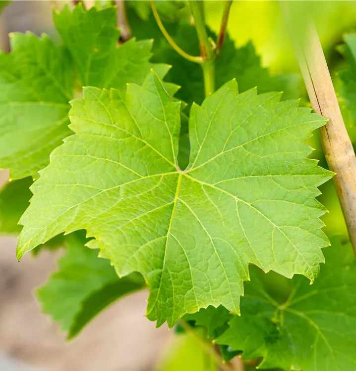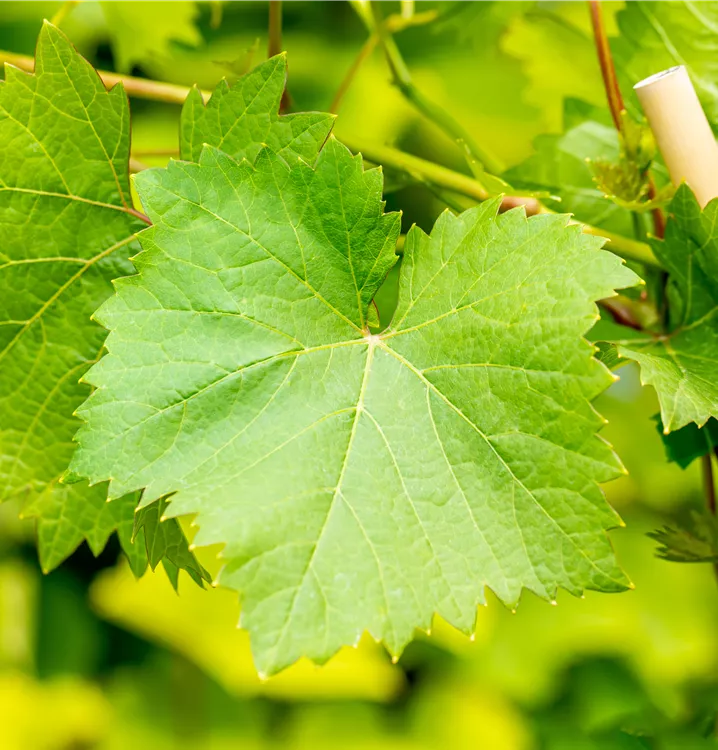 Die sommergrünen Blätter der Tafeltraube 'Nero'(s) sind dunkelgrün, herzförmig, gezähnt. Tafeltraube 'Nero'(s) zeigt sich leuchtend kupfergelb bis rot im Herbst.