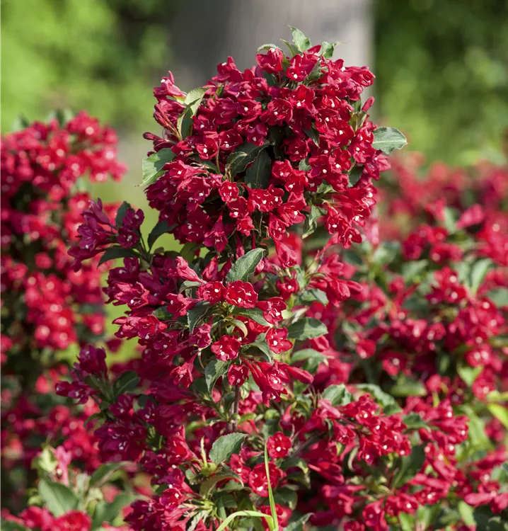 Die Weigelie 'Red Prince' (Weigela) ist ein kompakter Kleinstrauch, der rote, trichterförmige Blüten hervorbringt. Sie erscheinen von Mai bis Juni. Bei richtiger Pflege blüht die Weigelie 'Red Prince' erneut von August bis September. Zudem trägt die Weigelie 'Red Prince', lanzettliche, mittelgrüne Blätter. An einem sonnigen bis halbschattigen Standort mit durchlässigem, lockerem, nährstoffreichem Boden erreicht sie gewöhnlich eine Höhe von ca. 2 m und wird ca. 2 m breit.