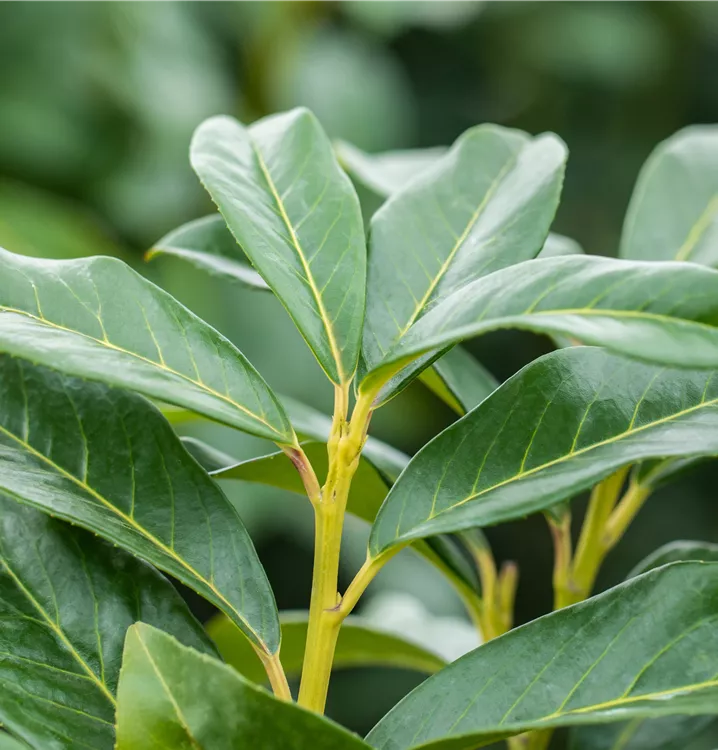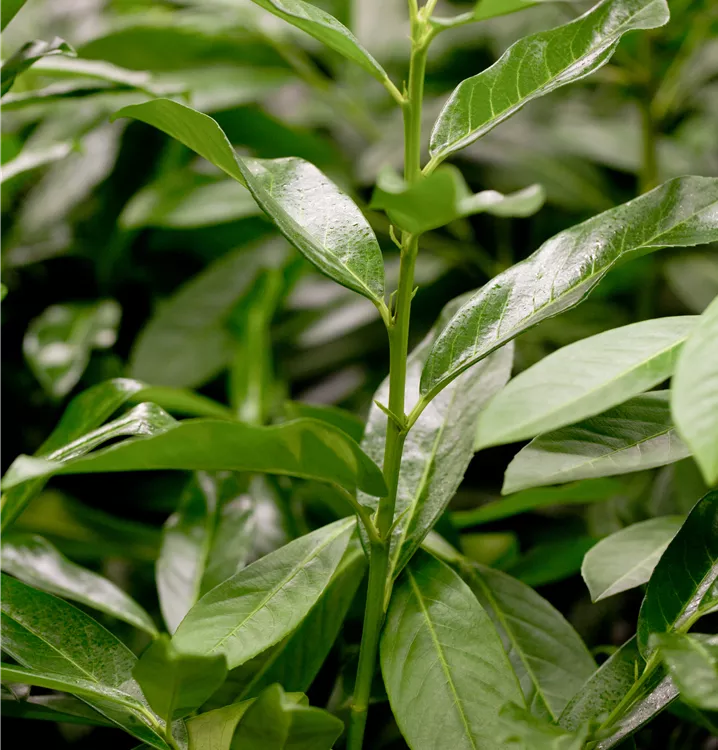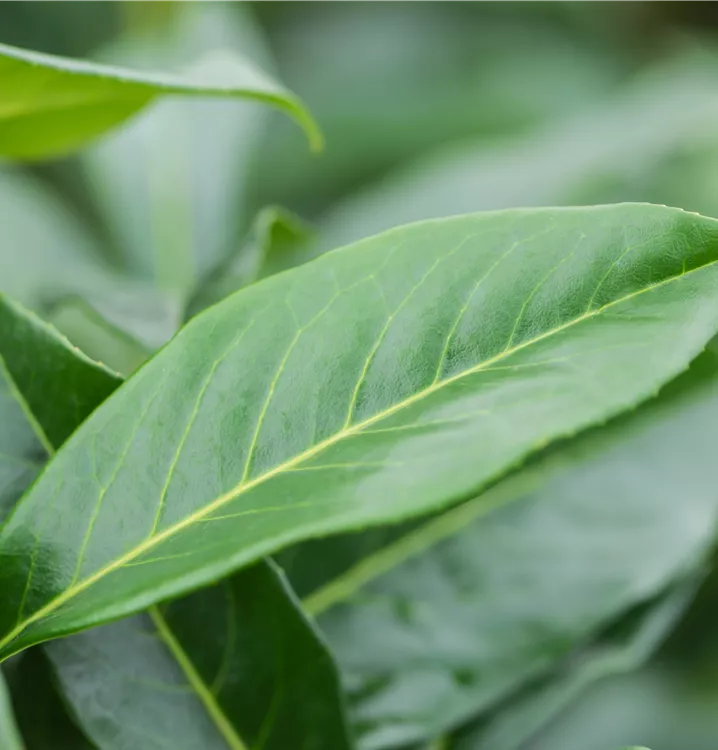 Die immergrünen Blätter der Lorbeerkirsche 'Genolia'® sind dunkelgrün, eiförmig, glänzend, wechselständig.