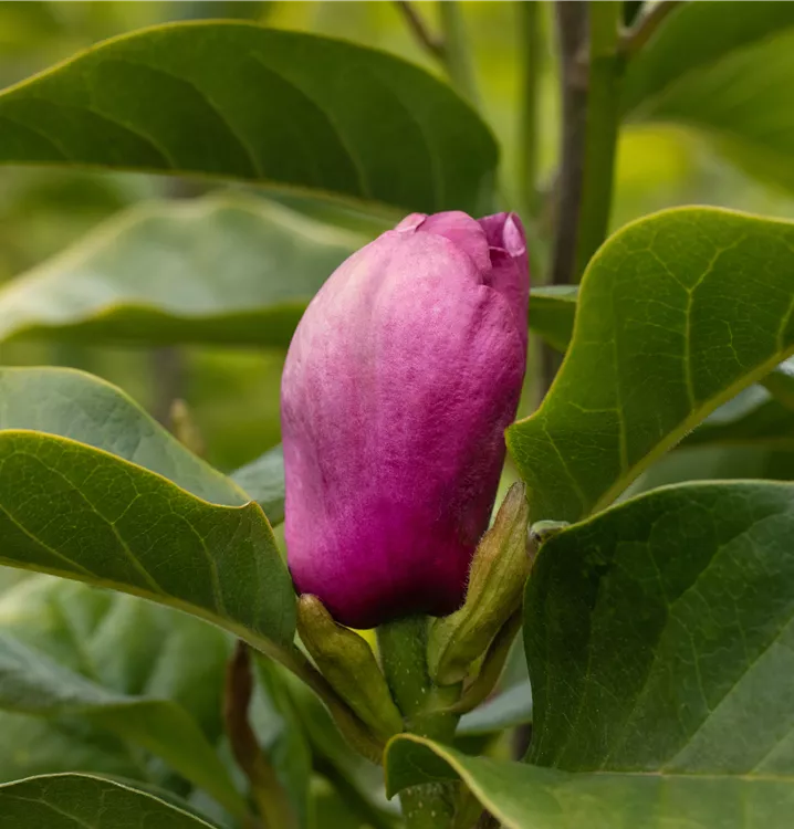 Die sommergrünen Blätter der Magnolie 'Black Tulip' sind mittelgrün, lanzettlich.