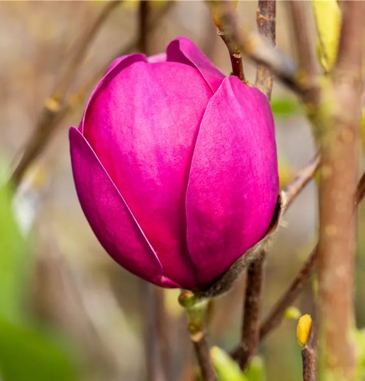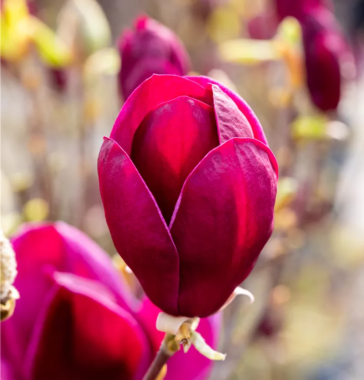 Magnolie 'Black Tulip' ist ein aufrecht und schlank wachsender Großstrauch. Sie erreicht gewöhnlich eine Höhe von 3 - 5 m und wird ca. 2,5 - 4 m breit. In der Regel wächst sie 30 - 50 cm pro Jahr.