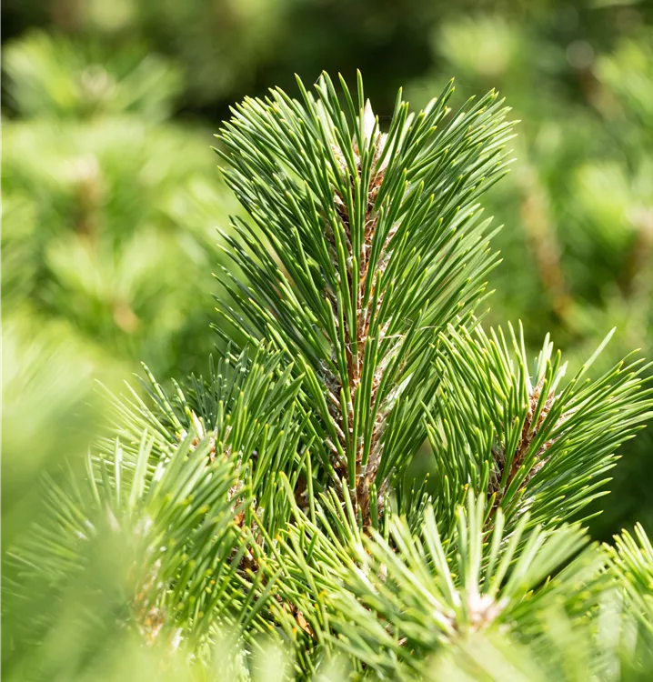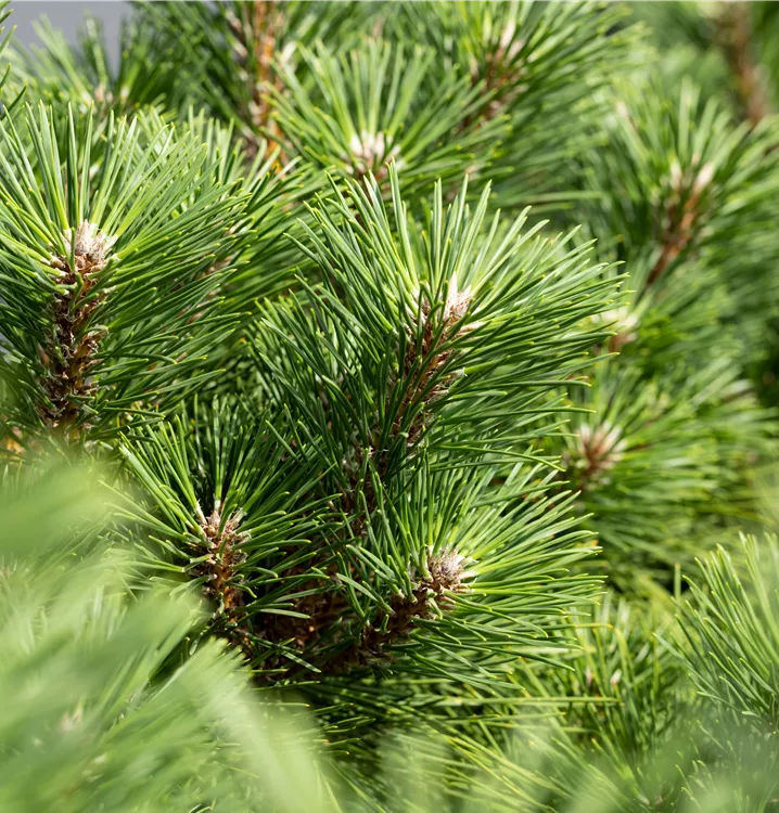 Die Japanische Schwarzkiefer 'Sayonara' ist immergrün. Ihre Nadeln sind dunkelgrün. Silberweißer Austrieb.