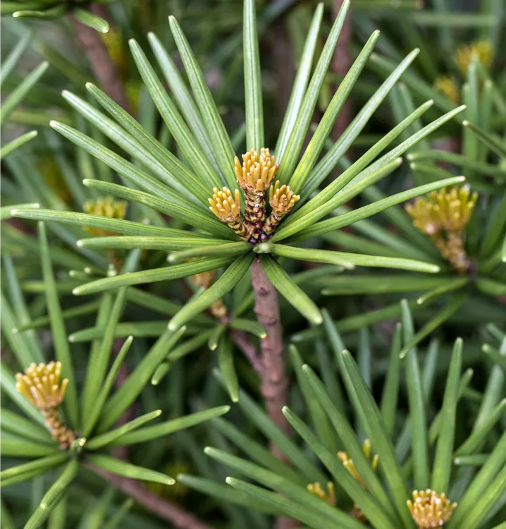 Besonders dekorativ sind die hellbraunen, länglichen Früchte von Sciadopitys verticillata 'Beauty Green'.