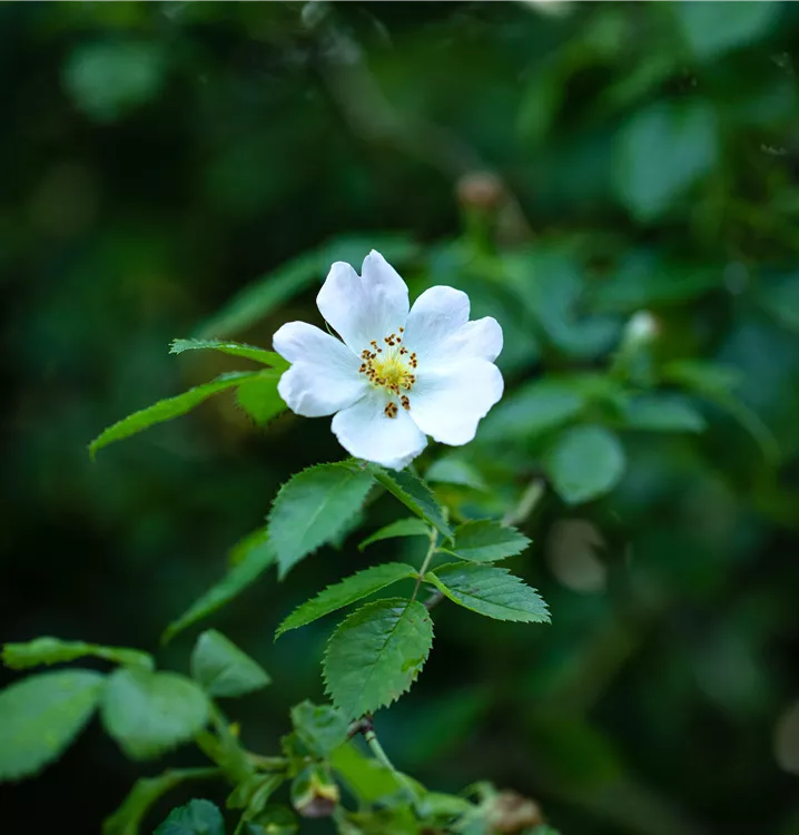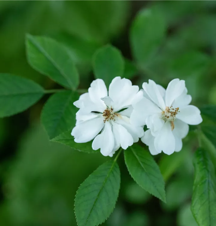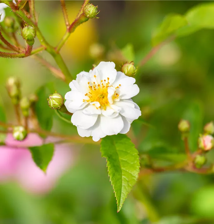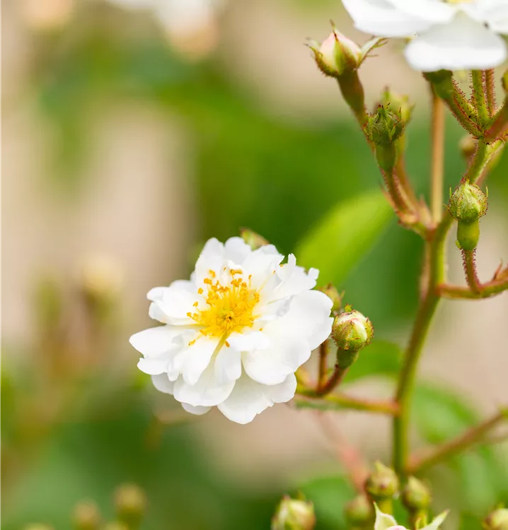 Die Vielblütige Rose (Rosa) ist eine reichblühende Rose, die im Garten aber auch auf Balkon oder Terrasse eine besondere Rolle spielt. Die zahlreichen Blüten sind weiß und erscheinen von Juni bis Juli. Ihr intensiver Duft entfaltet sich besonders an sonnigen, warmen Tagen. Zudem haben ihre runden, roten Früchte einen besonderen Zierwert, wenn sie ab September reif sind. Mit dem ausladenden und breiten Wuchs wird dieser Strauch bis zu 3 m hoch und 2,5 m breit.