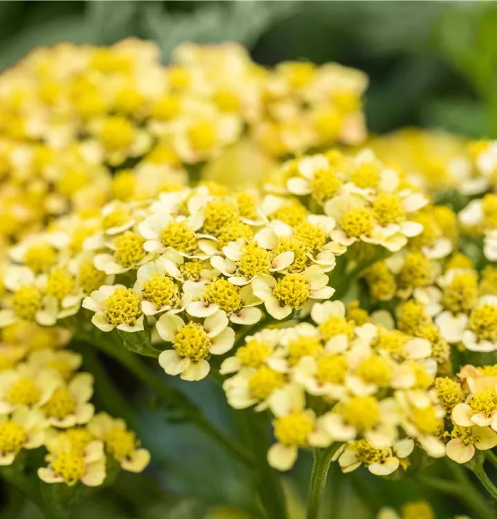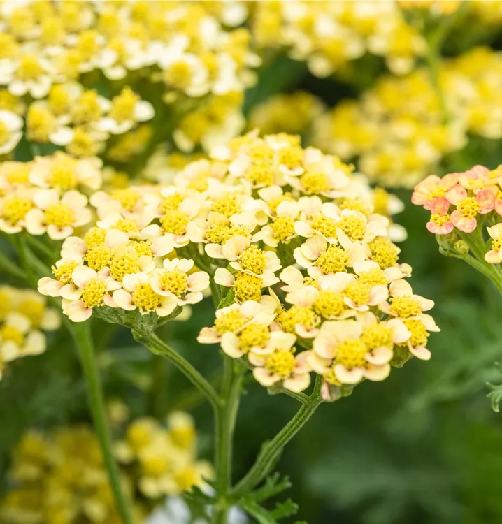 Achillea millefolium 'Milly Rock Yellow Terracotta' bildet in Dolden angeordnete, gelbe Blüten ab Juni. Diese verströmen einen angenehmen Duft. Bei richtiger Pflege Nachblüte im September.