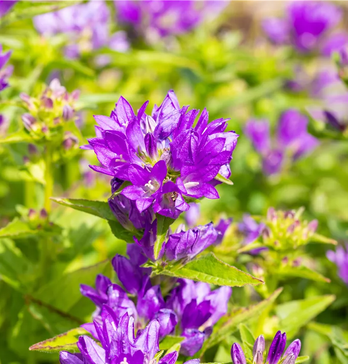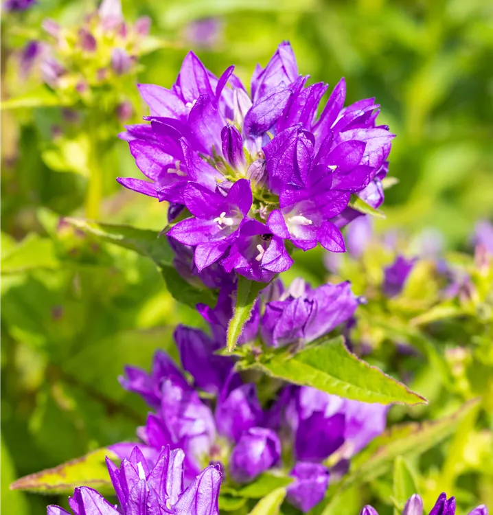 Campanula glomerata 'Acaulis' bildet glockenförmige, in Quirle angeordnete, violette Blüten ab Juni.