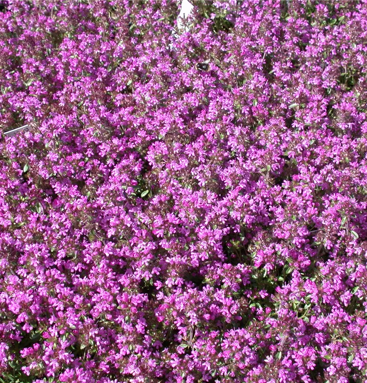 Der Garten-Thymian 'Creeping Red' (Thymus serpyllum) ist eine kriechende, wintergrüne Staude, die von Juni bis August rote Blüten bildet. An einem sonnigen Standort mit durchlässigem, nährstoffreichem, sandigem Boden erreicht er gewöhnlich eine Höhe von ca. 10 cm und wird ca. 30 cm breit. Der Garten-Thymian 'Creeping Red' ist gut frostverträglich.