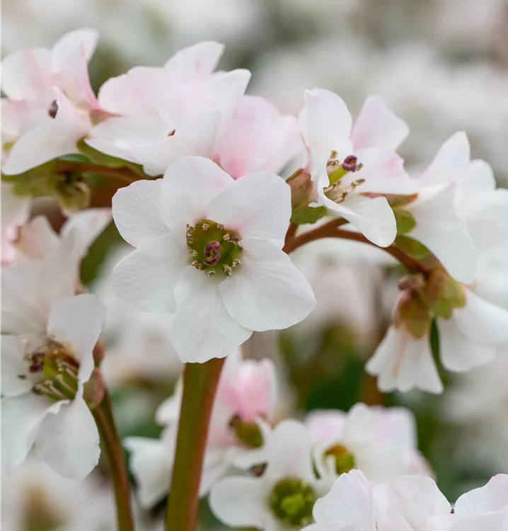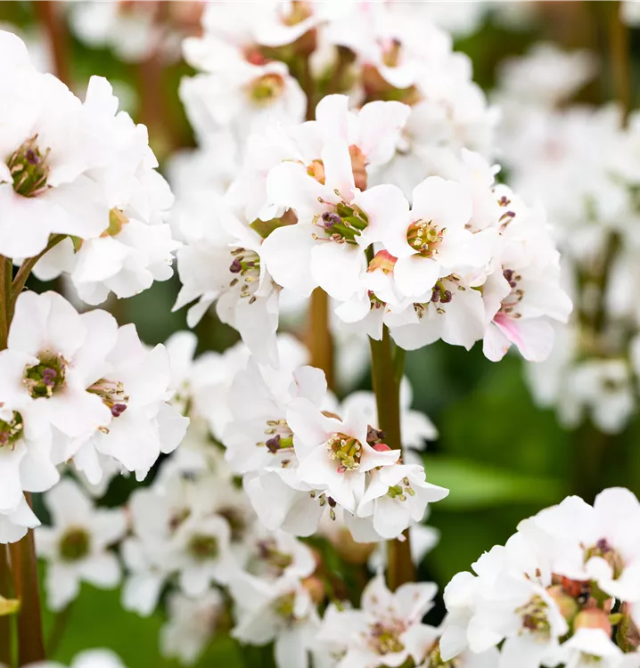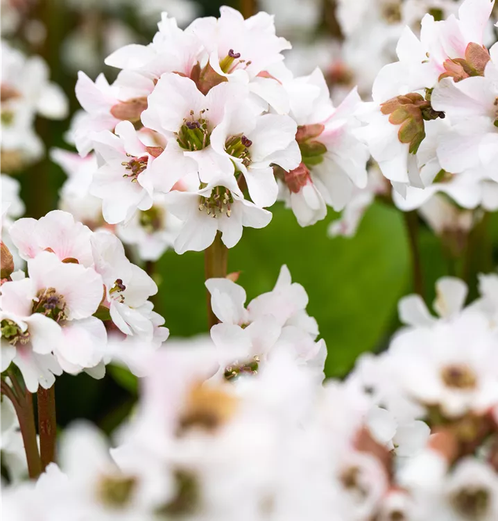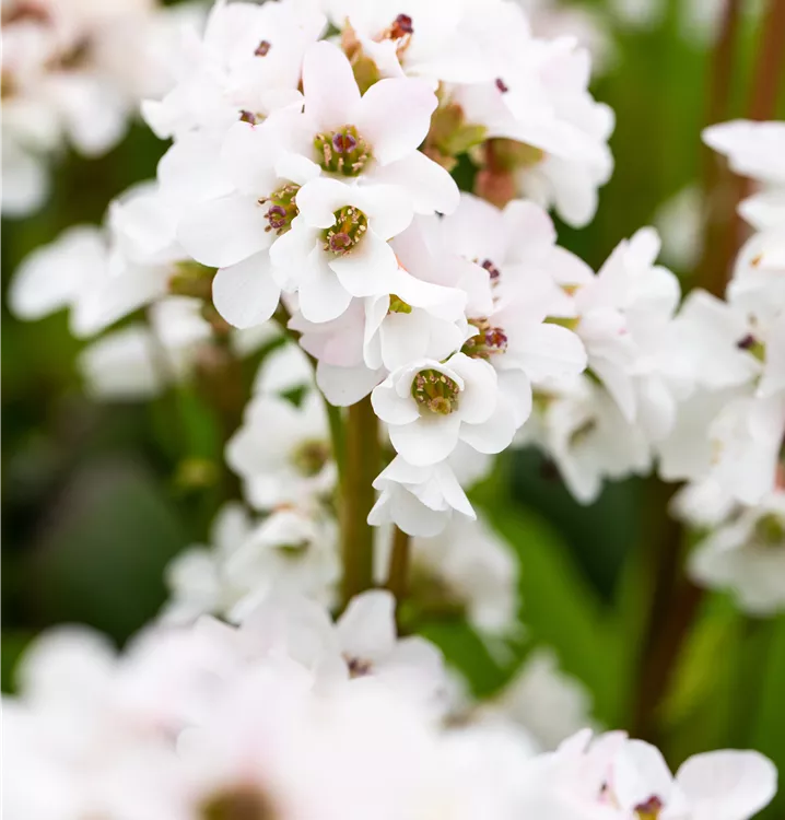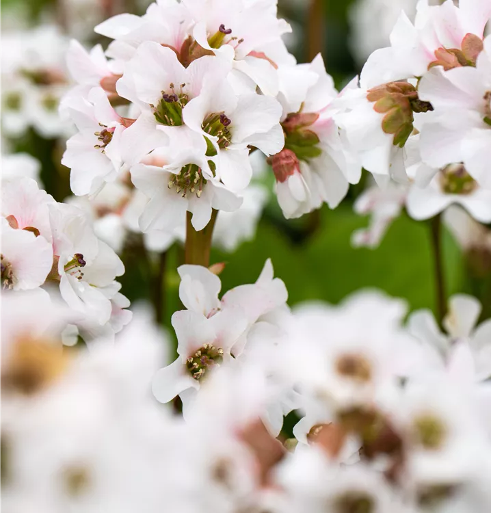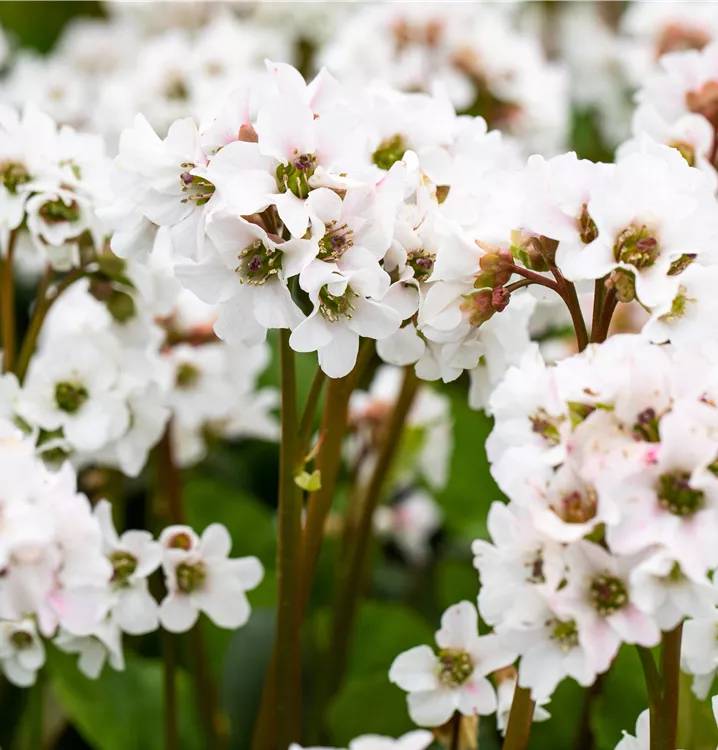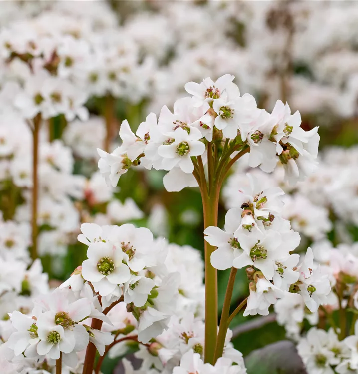 Bergenia cordifolia 'Schneekristall' bildet glockenförmige, in Dolden angeordnete, weiße Blüten ab April. Bei richtiger Pflege Nachblüte von November bis Dezember.