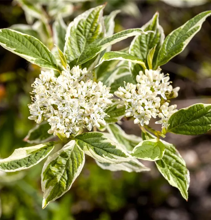 Die weißen Blüten des Hartriegel 'Sibirica Variegata' erscheinen in Trugdolden von Mai bis Juni.