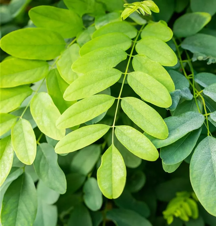 Die sommergrünen Blätter der Kugelakazie 'Umbraculifera' sind mittelgrün, gefiedert, wechselständig. Kugelakazie 'Umbraculifera' zeigt sich leuchtend gelb im Herbst.