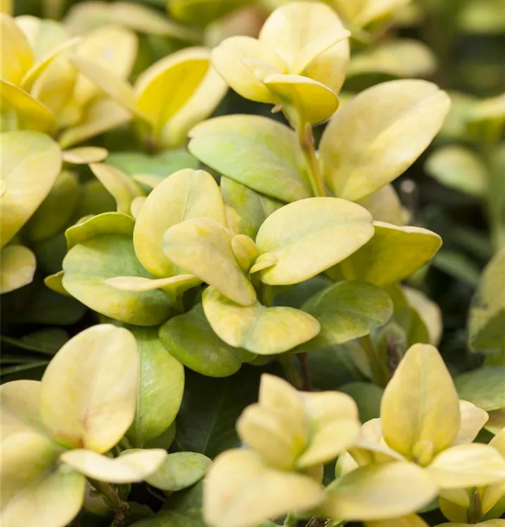 Die immergrünen Blätter des Berg-Ilexes 'Glorie Gem' sind dunkelgrün, rundlich, glänzend, wechselständig. Diese sind etwa 2 - 3 cm groß.