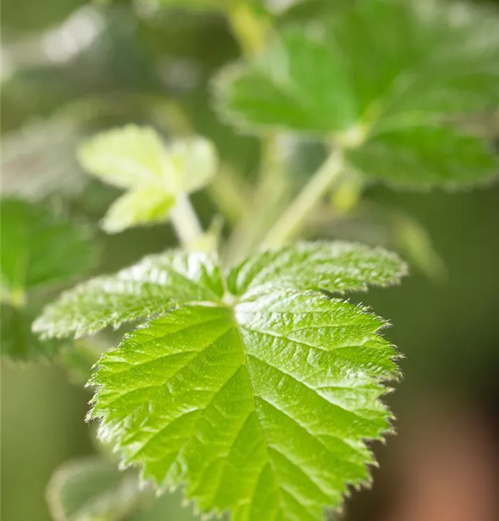 Die sommergrünen Blätter der Brombeere 'Loch Ness'(s) sind dunkelgrün, gefiedert, wechselständig. Brombeere 'Loch Ness'(s) zeigt sich leuchtend rot-braun im Herbst. Lange haftend.