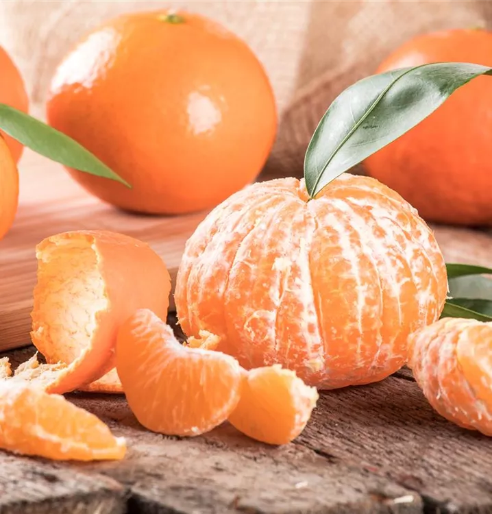 Citrus x aurantium bildet orangefarbene Früchte mit einem säuerlichen Geschmack. Reifezeit ab Januar.