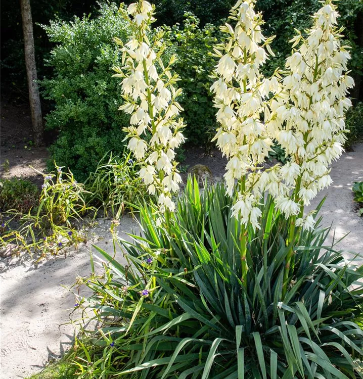 Yucca filamentosa bildet glockenförmige, in Rispen angeordnete, cremeweiße Blüten ab August.