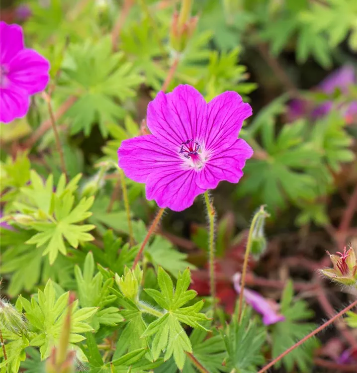 Geranium sanguineum 'Tiny Monster' bildet schalenförmige, magentafarbene Blüten ab Mai. Bei richtiger Pflege Nachblüte im September.
