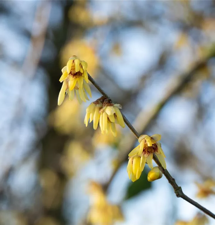 Die gelb-roten, glockenförmigen Blüten erscheinen von Januar bis März. Diese werden etwa 4 - 5 cm groß und sind stark duftend.