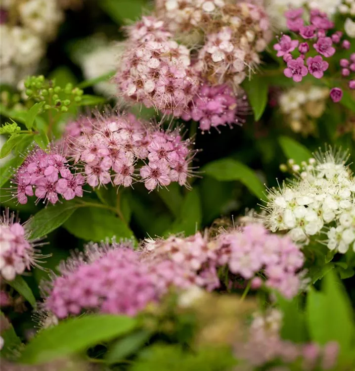 Die hellrosafarbenen Blüten der Sommerspiere 'Shirobana' erscheinen in Doldentrauben von Juli bis August.