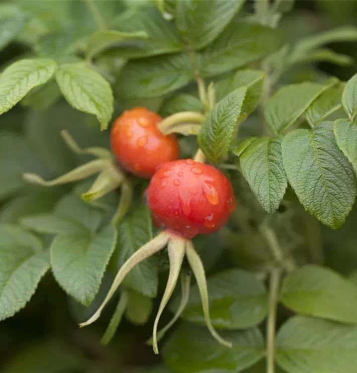 Besonders dekorativ sind die scharlachroten, runden Früchte von Rosa rugosa. Diese erscheinen ab Oktober.