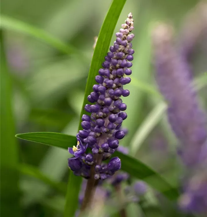 Liriope muscari 'Big Blue' bildet glockenförmige, in Rispen angeordnete, blaue Blüten ab August.