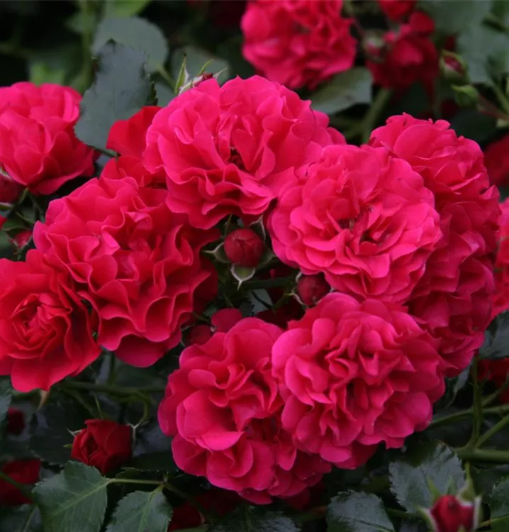 Die rosaroten, starkgefüllten, schalenförmigen Blüten der Bodendeckerrose 'Gärtnerfreude'® erscheinen in Dolden von Juni bis September. Diese werden etwa 2 - 3 cm groß.
