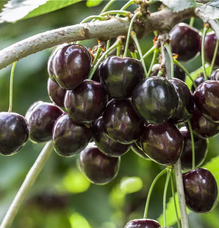 Prunus avium 'Kordia'® bildet dunkelrote, herzförmige Früchte.