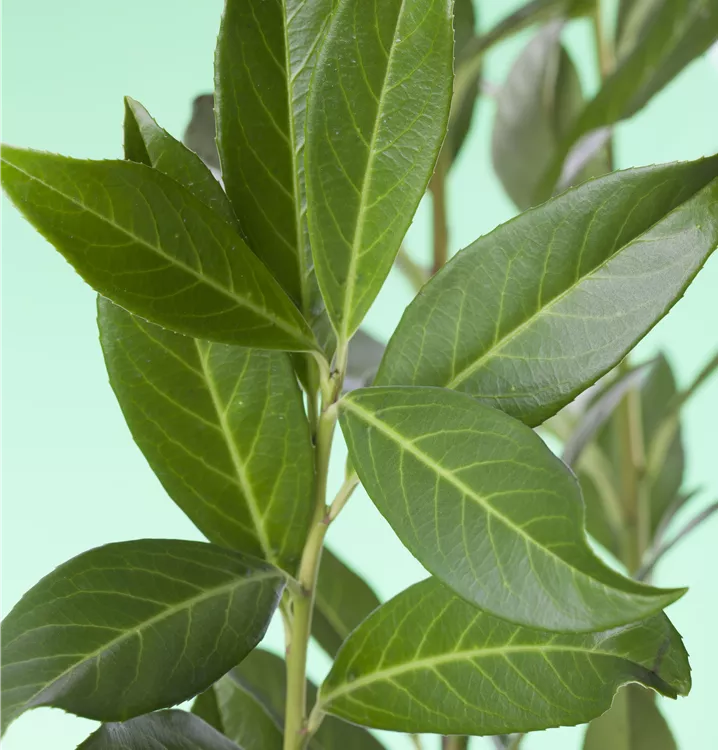 Die immergrünen Blätter der Kaukasische Lorbeerkirsche 'Caucasica' sind mittelgrün, eiförmig, glänzend, wechselständig.