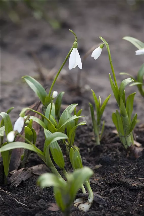 Galanthus Wenn Sie Schneeglöckchen pflanzen, gibt es nur wenig zu beachten und schon können sie mit einer schönen Blüte rechnen. Graben Sie Pflanzlöcher mit einer Tiefe von 5 – 8 cm in einem Abstand von 10 – 15 cm. Die Blumenzwiebeln werden mit der Spitze nach oben ins Pflanzloch gesetzt. Dann füllen Sie das Loch mit Erde auf, drücken sie fest und gießen die Zwiebeln kräftig an. Schneeglöckchen pflanzen Sie nicht in großen Gruppen, denn es bilden sich über Tochterzwiebeln ganz von selbst große Horste. Man kann die Blumenzwiebeln auch im Topf vorziehen. In diesem Fall wird die Zwiebel beim Auspflanzen nicht vollständig mit Erde bedeckt. Etwa zwei Zentimeter müssen aus der Erde ragen. Sind Schneeglöckchen erst einmal im Garten angekommen, brauchen sie nicht viel Pflege. Sie brauchen zum Beispiel nicht düngen. Trockenheit sollten Sie allerdings durch regelmäßiges Gießen verhindern. Wenn die Blätter verwelkt sind, werden sie entfernt, damit die Nährstoffversorgung auf die Blumenzwiebel übergeht und Sie auch im kommenden Jahr wieder kräftige Blumen im Garten haben.
